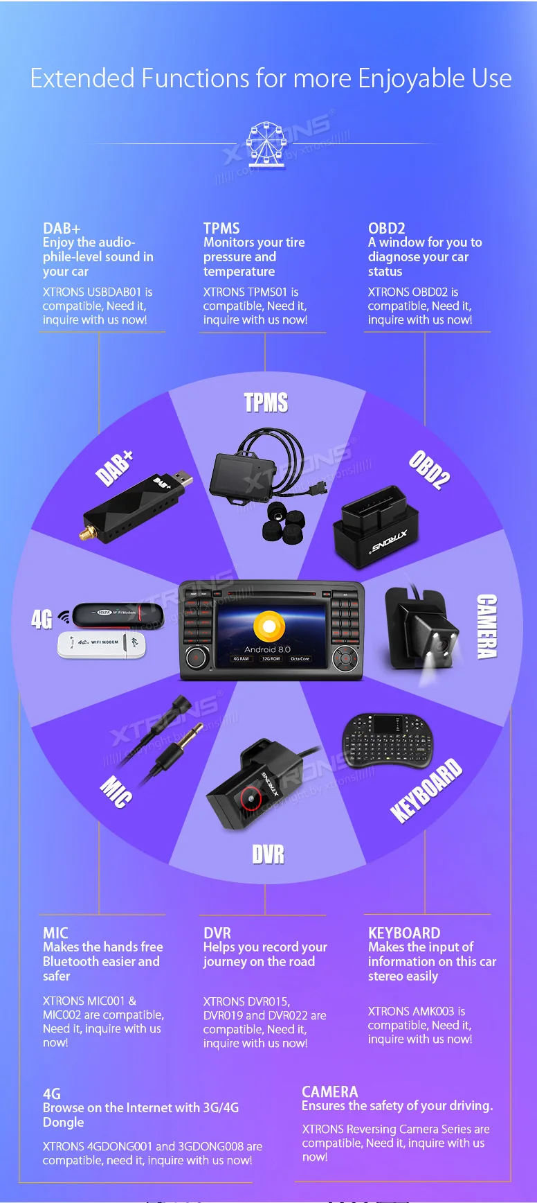 XTRONS 7" Android 8.0 Octa-Core 32GB ROM + 4G RAM Multimedia DVD Player Custom fit for Mercedes-Bens *Android 8.0 Octa-Core Operating System with XTRONS UI*32GB ROM + 4G RAM ,Faster performance*Google play protect,Added security*Multi-window view*1024*600 High resolution*Vibrant button colour schemes*Screen mirroring function*XTRONS heat sink and Fakara Original Radio & GPS Socket*DAB+ Tuner Ready*High quality bluetooth voice call*Support 3G/4G (3G/4G dongle needed)*Dual channel canbus*DVR INPUT Ready*Supports OBD2 Function*Tire Pressure Monitoring is Available*Built in SD/USB/DVD*Built-in radio tuner*Support online and offline maps*Optional Accessories to perfect your user Experience •Applicable Models & Years Mercedes-Benz ML- Class W164 (ML300 / ML350 / ML450 / ML500) (2005-2011), GL-Class X164 (G320 / G350 / G420 / GL450 / GL500)(2006-2012)Face Panel: 273/260*145mmAlthough we have made every effort to ensure this unit will be compatible with the listed vehicles, please check the year, dimensions and shape of the center console of your vehicles before purchasing.IMPORTANT NOTE:1. This unit does NOT support your vehicle's air conditioning information.2. Please be advised if your vehicle has COMAND APS NTG 2 system or COMAND APS NTG 2.5 system, you need to order an extra optical decoder box from XTRONS to retain your car's original COMAND system. (XTRONS FOBB02is compatible)3. Please check your vehicle's radio antenna port, you may need to order a cable to aid for the installation. (XTRONS ICE/ACS/ISOFZis compatible)4. Please note your CD changer will NOT work after installing this unit. •Top Hardware Configuration with Latest OSThe latest Operating System - Android OreoThe XTRONS PB78M164P is powered by the smarter, faster, and more powerful operating system Android 8.0.You will be in for the smoothest user experience ever experienced on a head unit.The Most Powerful HardwareWith the on-board Octa-Core processor and its 32GB ROM memory, the PB78M164P achieves ultra-fast running speeds with a smooth and efficient multi-task processing ability, satisfying even the most tech savvy users.Faster PerformanceAndroid Oreo minimizes background activity in the apps you use least and gets started on your favorite tasks more quickly with twice the boot speed when powering up.Boot time was measured on the same hardware and with a different version of the Android OS.Google Play Protect, Added SecurityYou can now permit the installation of APKs per-source, so that hostile downloader apps can't operate without your permission.By scanning over 50 billion apps per day, Android Play Protect automatically helps to keep the hardware and your data safe from hostile apps, and ensures that your unit is clear, fast, and performing at its best.Do Two Things at OnceNow you can switch and run two apps on screen side by side.So go ahead listening to music through your favorite app whilst navigating, or making a phone call with your browser open. •Always the XTRONS DesignLatest User InterfaceThe XTRONS PB78M164P features a responsive, powerful and intuitive user interface that is easy to navigate and highly customizable.Sleek Appearance and High Definition DisplayWith its 1024*600 resolution and a highly sensitive and intuitive touch screen, you will be amazed and enjoy super sharp image display.Vibrant Button Colour SchemesChoose various coloured buttons to match different needs.The random changing button schemes create a vibrant and dynamic visual experience.1. Free to choose your favorite colour.2. Random change button colour.Redesigned Back EndWith the newly designed heat sink and connectors,we have maximised the connection capabilities of the Android unit, whilst keeping the wires simple and tidy for installation.Customised Connectors: The plug & go design aims to match the original connectors, to make installation as easy and hassle-free as possible.FAKRA Type GPS / Radio Antenna Port: FAKRA connectors are designed to perform up to 3 GHz to meet the automative mechanical and environmental requirements.Thickened Aluminum Heat Sink: Specially designed for efficient heat dissipation. •Max out Entertainment in Your JourneyScreen Mirroring FunctionScreen mirroring allows you to mirror your phone's screen on this unit.You can choose to read messages or watch videos directly on the screen of this head unit instead of on your phone. Just connect your phone and go.Note: Not all smartphones are compatible with screen mirroring function.Multiple Input SourcesExpand your media choices by plugging your USB stick or SD card into this unit to play music, video or view photos.The PB78M164P is compatible with most DVDs and CDs that are available on the market.Note: 1. The USB and SD maximum capacity is 128GB, but the files in the USB and SD card should be within 4GB.2.The DVD driver in this unit only support 120mm Disc.DAB+ Tuner ReadyEnjoy the High Quality Sound in your CarWith the optional DAB+ radio receiver stick, which connects via the USB port, you can enjoy better sound quality and stronger digital audio broadcasting channels.Note:DAB+ radio receiver stick(Optional), XTRONS USBDAB01 is compatible. Need it, inquire with usnow! High Quality Bluetooth Voice CallWith the new and updated Bluetooth module, you can now enjoy Bluetooth interference-free phone calls in higher quality and with more clearness.Hands Free CallsBluetooth Music3G / 4G Module with Hotspot FunctionSurf the Internet on the go with the XTRONS dongles.By inserting a SIM card into the XTRONS 3GDONG008 or 4GDONG001, you can use them as a hotspot to connect WiFi enabled devices to.Your head unit, tablets or smartphones within your vehicle can connect via the dongle's hotspot to browse the Internet whilst on the road.Note: Other 3G / 4G dongles may not compatible with this unit. •Keeping Informed and Staying SafeDual Channel CANbusThe dual channel CANbus is designed as a perfect fitting for Mercedes-Benz, it builds a close relationship between this 