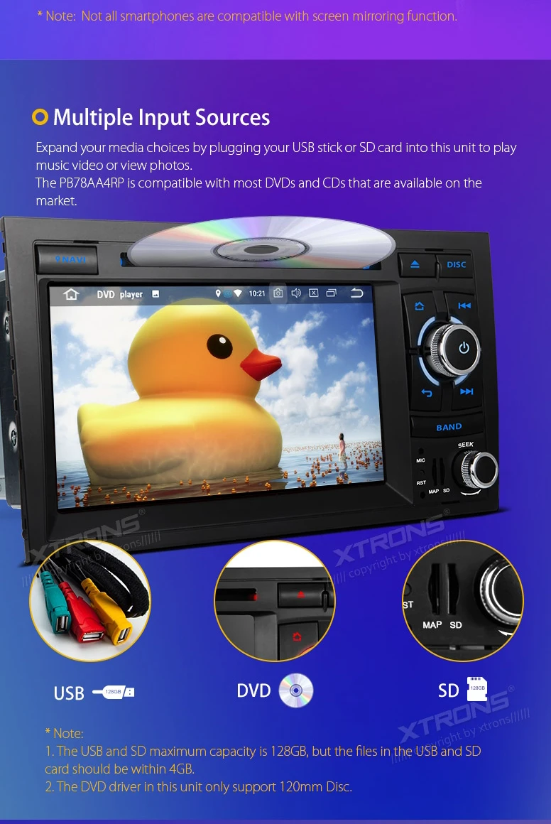 7" Octa-Core Android 8.0Oreo OS SpecialCar DVD Multimedia Navigation GPS Radio forSeat Exeo2008-2013 with 4GB RAM32GB ROM & Multi-Window View Support & 4G/3G/WIFI Internet Support & External TPMS System Support & External DAB+ Receiver Box Support & ExternalOBD2 Adapter Support & Front DVR Camera Support & Bluetooth 5.0 Support Important Notice Before the Purchase/Delivery: 1. Please check whether your vehicle's original CD is single din size, if it is, this unit can NOT fit with your car. 2. Please check to see whether your car's radio antenna port is the same as the relevant picture in the poster, if it is, you need to order a radio antenna adapter cable to aid for the installation.(XTRONS ICE/ACS/ISOFZ is compatible) 3. This head unit is compatible with your car's original BOSE system, you just have to connect the amplifier control cable in the ISO wiring harness with the amplifier control cable in the RCA cable. 4. Please note that if your vehicle has no BOSE system, but it has the audio port as the relevant picture in the poster, you need to ask for a professional techinician to make some modifications of the wiring connection, otherwise, your rear amplified speakers will NOT have sound. 5. Please check to see whether there is RNS-D (Radio Navigation System)or BNS 5.x(Basic Navigation System), if there is, this unit is NOT compatible with your car. 6. Although we have made every effort to ensure this item be compatible with the listed vehicles, please check the year, dimensions and shape of the center console of your vehicles before purchasing. 7. Please note that this unit does not come with any GPS map and the navigation software has to be downloaded from the Google Play store. 8. The DVD driver in this unit only supports 120mm discs. 9. This car radio's screen mirroring function is compatible with most of smartphones, but not all smartphones. 10. The USB and SD maximum capacity is 128GB, but the files in the USB stick or SD card should be within 8GB. Optional Items/Function Modules: 1. Universal Rear CameraCAM009: USD28.00 2. External MicrophoneMIC001:USD7.00(1.70Meters) 3. External MicrophoneMIC002:USD10.00(3.00 Meters) 4.Bluetooth OBD2 BoxOBD02: USD15.00 5.4G/3G Internet USB Modem& USBWIFIRouter4GDONG001: USD65.00 6. WCDMA 3G Dongle3GDONG008: USD40.00 7.External Wired 720PDVR CameraDVR019: USD35.00 8.External WIFI Wireless1080PDVR CameraDVR022: USD95.00 9. External DAB+ BoxUSBDAB01: USD55.00 10. 2.4GHz Wireless Mini KeyboardAMK003: USD28.00 11. External TPMS SystemTPMS01: USD100.00 12.Single Antenna MPEG2/4 DVB-T Digital TV Receiver BoxFV009: USD75.00 13. Dual Antennas MPEG2/4 DVB-T Digital TV Receiver BoxFV010: USD95.00 14.Dual Antennas H.264 HEVC/DVB-T2/MPEG2/4 DVB-T Digital TV Receiver BoxFV011: USD132.00 15.Dual Antennas H.265 HEVC/H.264 AVC/1080i/1080P/DVB-T2/MPEG2/4 DVB-T Digital TV Receiver BoxFV012DE: USD148.00(for Germany & Austria) 16. DAB+ Box & Dual Antennas MPEG2/4 DVB-T Digital TV Receiver BoxFVDAB01: USD105.00 17.Radio Antenna AdapterICE/ACS/ISOFZ:TO BE AVAILABLE Please note that the listedcompatible models are only for reference only. To make sure that the car radio is really compatible with your car, please compare the shape & size of the car radio and the power cable connector with your original car first. Compatible for belowAudimodels: *Audi A4 B6(8E/8H)2000-2006 *Audi A4 B7(8E/8H)2004-2008 *Audi S4 B7(8E/8H)2005-2008 *Audi S4 B6(8E/8H)2003-2005 *Audi RS4 2002-2008 *Audi RS4 B7(8E)2006-2008 & Also Compatible for belowSeatmodels: *Seat Exeo2008-2013